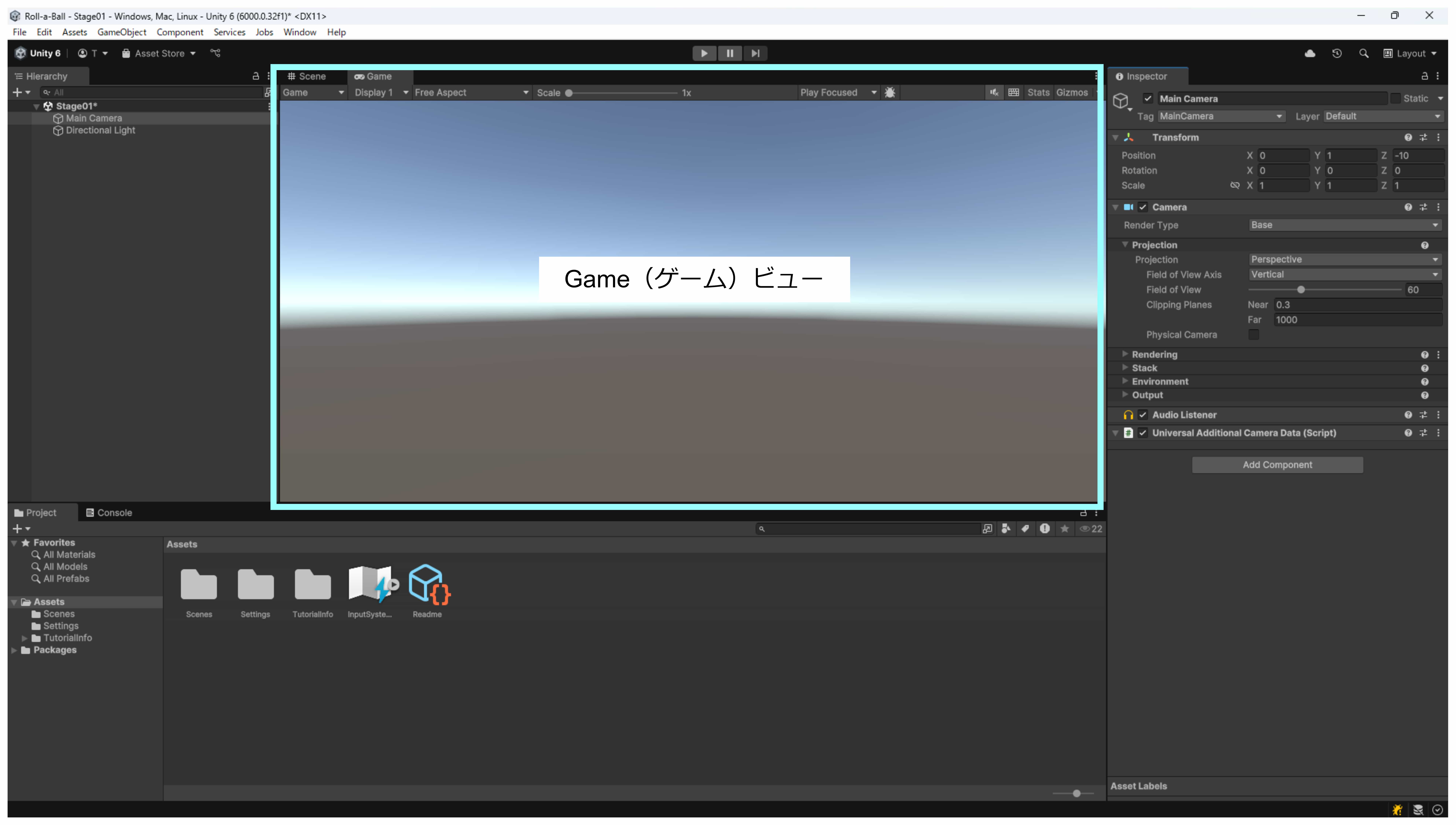 Gameビューはゲーム画面です。実際にゲームをプレイする画面で、プレイヤーの操作やUIの操作をこの画面で行います。 -