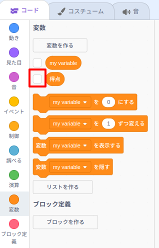 表示をさせたくない場合はブロックパレットの変数名の左のチェックボックスを外します。