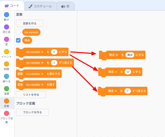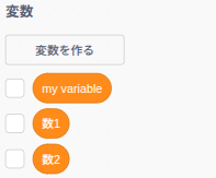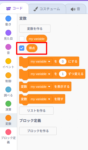 変数を作るとブロックパレットのブロックに変数名が表示されます。