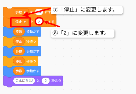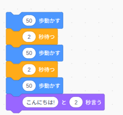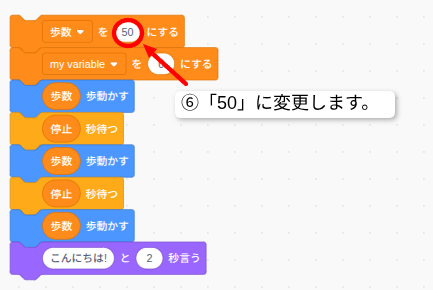 次に、作ったはいいが10歩を50歩に、1秒を2秒に変更したい場合、5つのブロックの値を手動で変更する必要があります。
