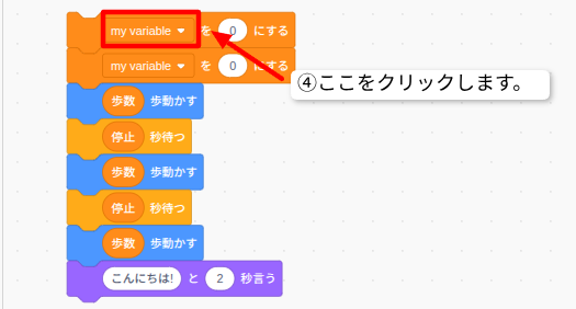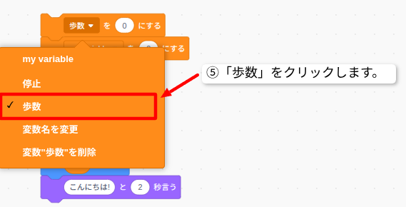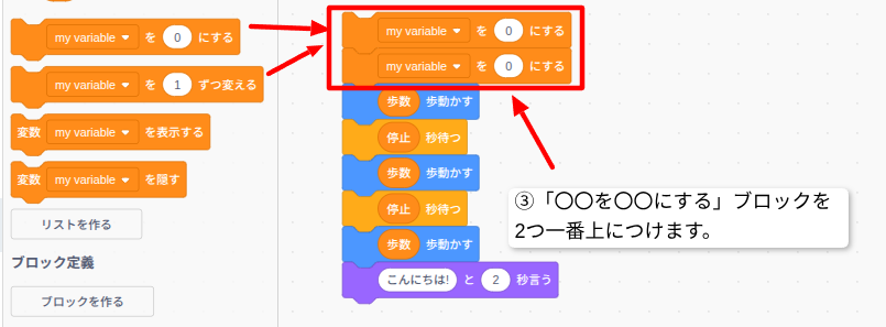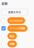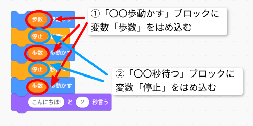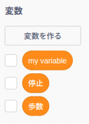 「歩数」と「停止」の変数を作成し、各ブロックにはめ込んでいきます。
