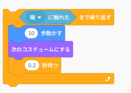 以下は、「ネコを10歩動かし、次のコスチュームにし、0.2秒まつ」という処理を「ネコが端に触れる」まで繰り返すプログラムです。