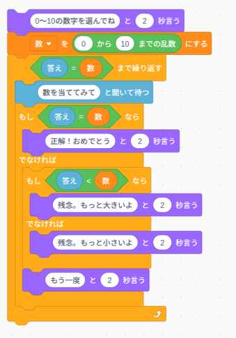 入力した値が変数「数」より大きい場合は「残念。もっと小さいよ」と言い再度入力を求めます。