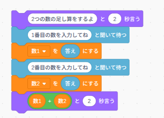 ネコが2つの数字を聞いてきます。順番に入力した値を足し算するプログラムを作成します。
