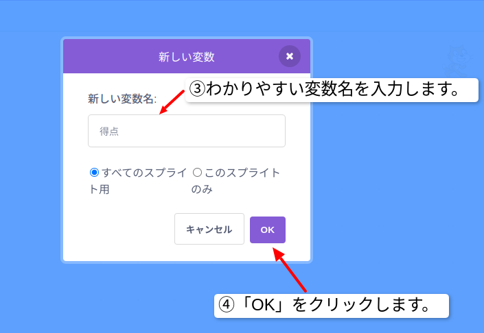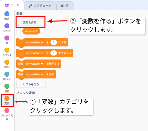 実際にScratchで変数を作成してみましょう。「変数」カテゴリにある「変数を作る」ボタンで作成します。