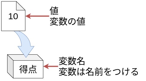 変数は、値や文字など変化する値を入れる箱のようなものです。